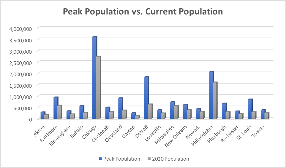 Of the 18 cities2, most lie within the American Rust Belt, and few evoke visions of the future. For many, these cities feel frozen in time. Declining, forgotten, unwanted.