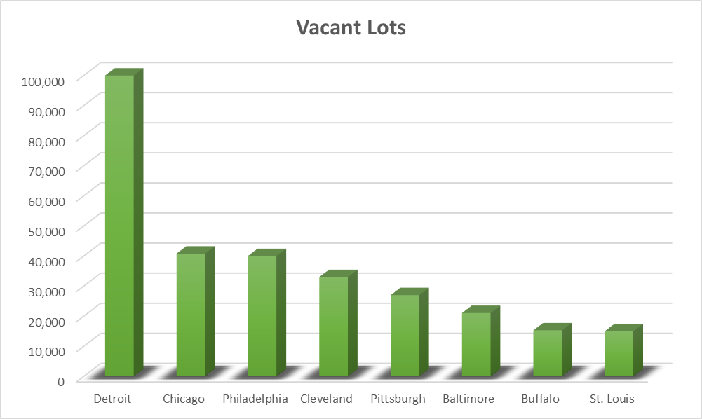 Take Detroit—America’s most extreme case of urban shrinkage. The city mows 100,000 vacant lots each year2 just to hold back blight, a stopgap that offers no lasting solution. And Detroit is not alone. Seven other major American cities each have more than 15,000 vacant lots.